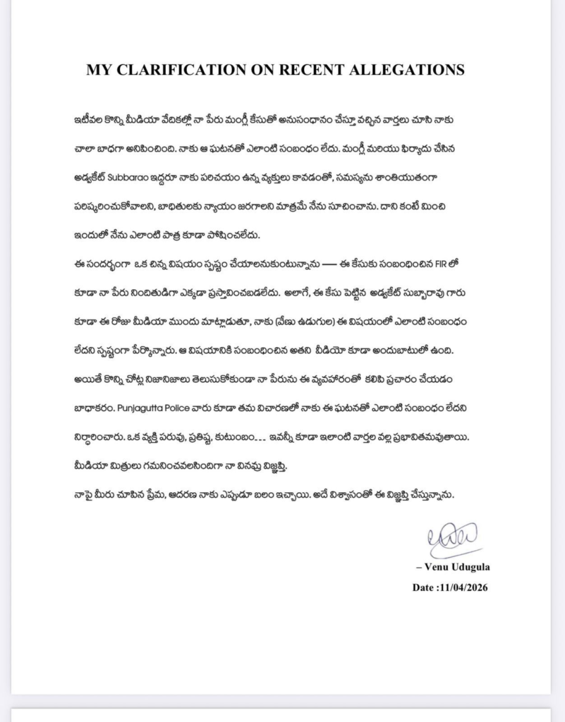 వేణు ఊడుగుల స్పందిస్తూ – గాయని మంగ్లీ కేసులో నా పేరును చేర్చుతూ కొన్ని మీడియా సంస్థలు ప్రచారం చేస్తున్న వార్తలు చూసి బాధపడ్డాను. మంగ్లీ, లాయర్ సుబ్బారావు ఇద్దరూ నాకు తెలిసిన వాళ్లు కావడంతో సమస్యను సామరస్యంగా పరిష్కరించుకోవాలి, బాధితులకు న్యాయం చేయాలని సూచించాను. ఇంతవరకే ఈ కేసులో నా పాత్ర. ఈ కేసు ఎఫ్ఐఆర్ లో కూడా నిందితుడిగా నా పేరు ఎక్కడా ప్రస్తావించలేదు. అడ్వకేట్ సుబ్బారావు ఈ రోజు మీడియాతో మాట్లాడుతూ వేణు ఊడుగులకు ఈ కేసుతో ఎలాంటి సంబంధం లేదని స్పష్టంగా చెప్పారు. పంజాగుట్ట పోలీసులు కూడా ఈ కేసుతో నాకు సంబంధం లేదని నిర్థారించారు. మీ వార్తల వల్ల ఒక వ్యక్తి పరువు, ప్రతిష్ట, కుటుంబం ప్రభావితం అవుతాయని మీడియా మిత్రులు గమనించగలరు. మీరు నాపై ఇంతకాలం చూపిన ప్రేమ, ఆదరణ నాకెంతో బలాన్నిచ్చాయి. ఇప్పుడూ అదే ప్రేమను కొనసాగిస్తారని కోరుకుంటున్నా. అన్నారు.