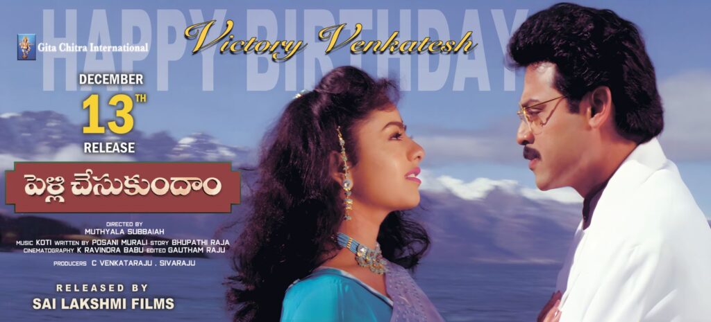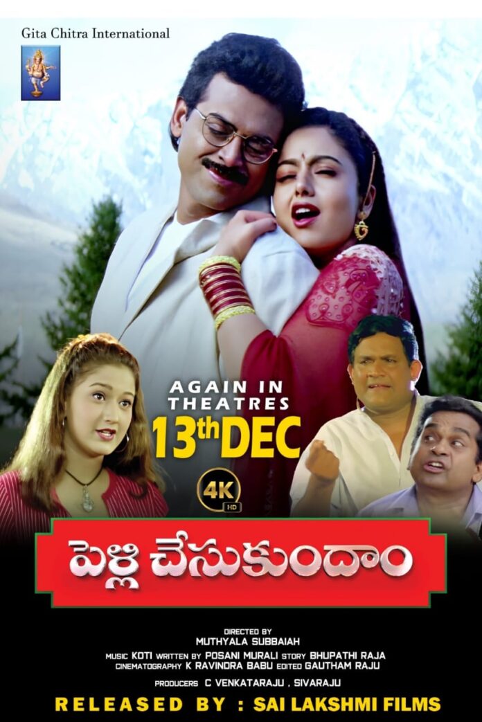విక్టరీ వెంకటేష్ నటించగా అసాధారణ విజయం సాధించిన చిత్రాల్లో “పెళ్ళి చేసుకుందాం” ఒకటి. అందం – అభినయాల కలబోత సౌందర్య హీరోయిన్ గా సుప్రసిద్ధ దర్శకులు ముత్యాల సుబ్బయ్య తెరకెక్కించిన ఈ ట్రెండ్ సెట్టింగ్ చిత్రాన్ని సి.వెంకట్రాజు – శివరాజు సంయుక్తంగా నిర్మించారు. పోసాని కృష్ణమురళి సంభాషణలు ఈ చిత్రానికి ప్రత్యేక ఆకర్షణ. ఈ చిత్రాన్ని సాయిలక్ష్మీ ఫిలిమ్స్ పతాకంపై వరప్రసాద్ రెండు తెలుగు రాష్ట్రాల్లో 4 కె లో భారీ స్థాయిలో విడుదల చేస్తున్నారు!!