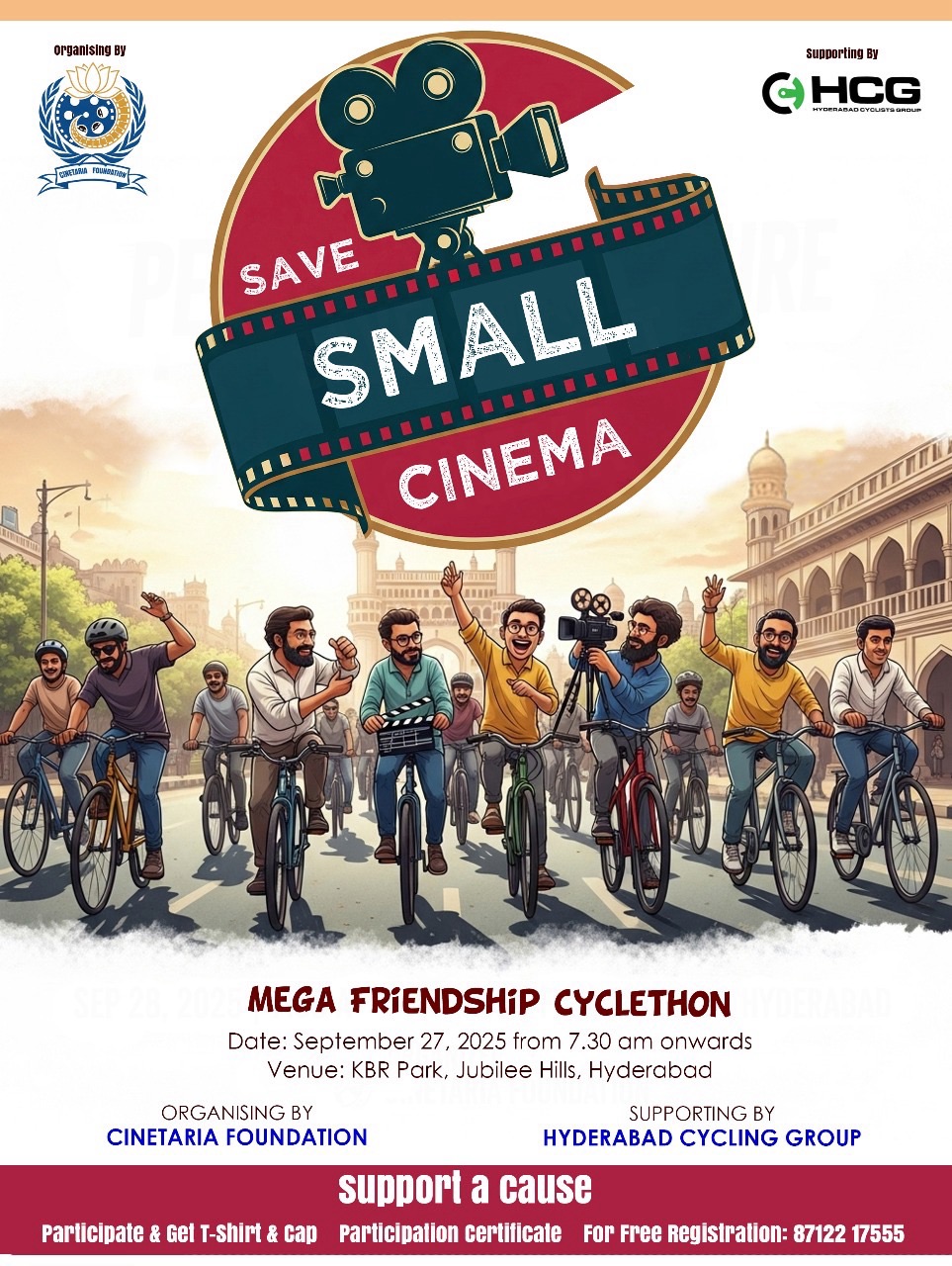 చిన్న సినిమా నిర్మాతలు – సినిమా నిర్మాణం, పబ్లిసిటీ, విడుదల, సినిమాల వాణిజ్యం రంగాలలో ఎదుర్కొంటున్న సమస్యల నిర్మూలన మరియు ఆయా సమస్యలగూర్చి మరింత అవగాహన కోసం సినెటేరియా ఫౌండేషన్ మరియు హైదరాబాద్ సైక్లింగ్ క్లబ్ లు సమ్యుక్తంగా సేవ్ స్మాల్ (స్మాల్ బడ్జెట్) సినిమా – మెగా ఫ్రెండ్ షిప్ సైక్లథాన్ కార్యక్రమాన్ని సెప్టెంబర్ 27, 2025న, ఫిలిం చాంబర్ నుంచి కె.బి.ఆర్ పార్క్ వరకు నిర్వహించనుంది.