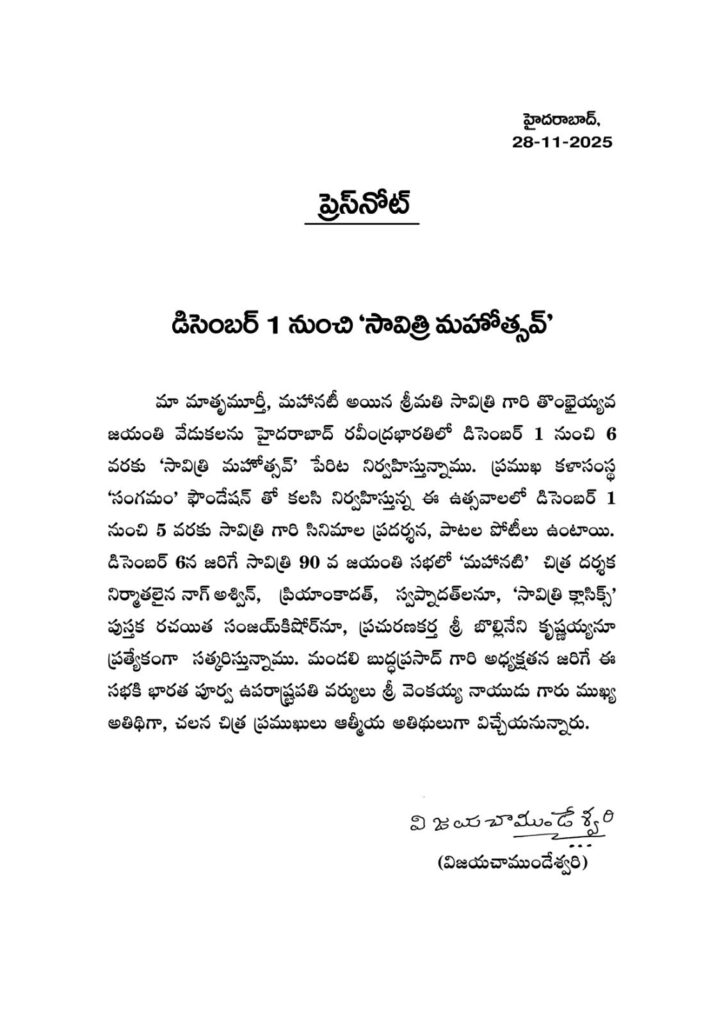 “మా మాతృమూర్తీ, మహానటీ అయిన శ్రీమతి సావిత్రి గారి 90వ జయంతి వేడుకలను హైదరాబాద్ రవీంద్రభారతిలో డిసెంబర్ 1 నుంచి 6 వరకు ‘సావిత్రి మహోత్సవ్’ పేరిట నిర్వహిస్తున్నాము. ప్రముఖ కళా సంస్థ “ సంగమం” ఫౌండేషన్ తో కలిసి నిర్వహిస్తున్న ఈ ఉత్సవాల్లో డిసెంబర్ 1 నుంచి 5 వరకు సావిత్రి గారి సినిమాల ప్రదర్శన, పాటల పోటీలు ఉంటాయి.