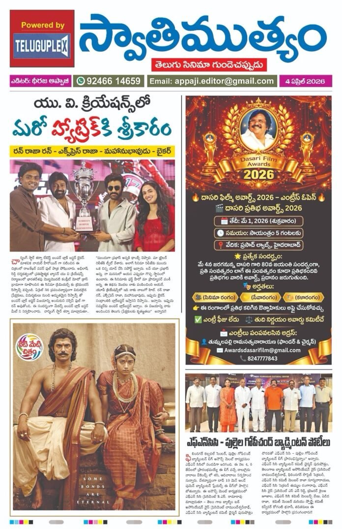 HomeEpaperSwathimutyam Epaper 04-03-2026 Epaper Swathimutyam Epaper 04-03-2026 By Teluguplex April 4, 2026 0 10 Share FacebookXPinterestWhatsApp - Advertisment - - Advertisment - Share FacebookXPinterestWhatsApp Previous article“రణబాలి” మూవీ అనంతపూర్ షెడ్యూల్ కంప్లీట్, సీమ వాసుల అభిమానానికి కృతజ్ఞతలు తెలిపిన హీరో విజయ్ దేవరకొండNext articleఎఫ్ఎన్ సిసి -పుల్లెల గోపీచంద్ బ్యాడ్మిండన్ లీగ్ Teluguplexhttps://lightgoldenrodyellow-wildcat-391238.hostingersite.com RELATED ARTICLES Most Popular హీరో కిరణ్ అబ్బవరం కేఏ ప్రొడక్షన్స్, సుమైర స్టూడియోస్ నిర్మిస్తున్న”తిమ్మరాజుపల్లి టీవీ” మూవీ నుంచి ‘నిజమేనా’ లిరికల్ సాంగ్ రిలీజ్ April 4, 2026 జర్నలిస్టు మిత్రుల చేతుల మీదుగా రఘుకుంచె “గేదెల రాజు” సినిమా ట్రైలర్ రిలీజ్, ఈ నెల 17న గ్రాండ్ థియేట్రికల్ రిలీజ్ కు వస్తున్న మూవీ April 4, 2026 RAYSUN ప్రొడక్షన్స్ బ్యానర్పై గోపీ కృష్ణ నిర్మాణంలో, రాధిక జయంతి దర్శకత్వంలో తెరకెక్కుతున్న “రాయవలస” సినిమా నుంచి నవ యువ కథానాయకుడు కార్తిక్ జయంతి ఇంటెన్స్ ఫస్ట్ లుక్ రిలీజ్. April 4, 2026 మరో హ్యాట్రిక్ కి శ్రీకారం April 4, 2026 Load more Recent Comments