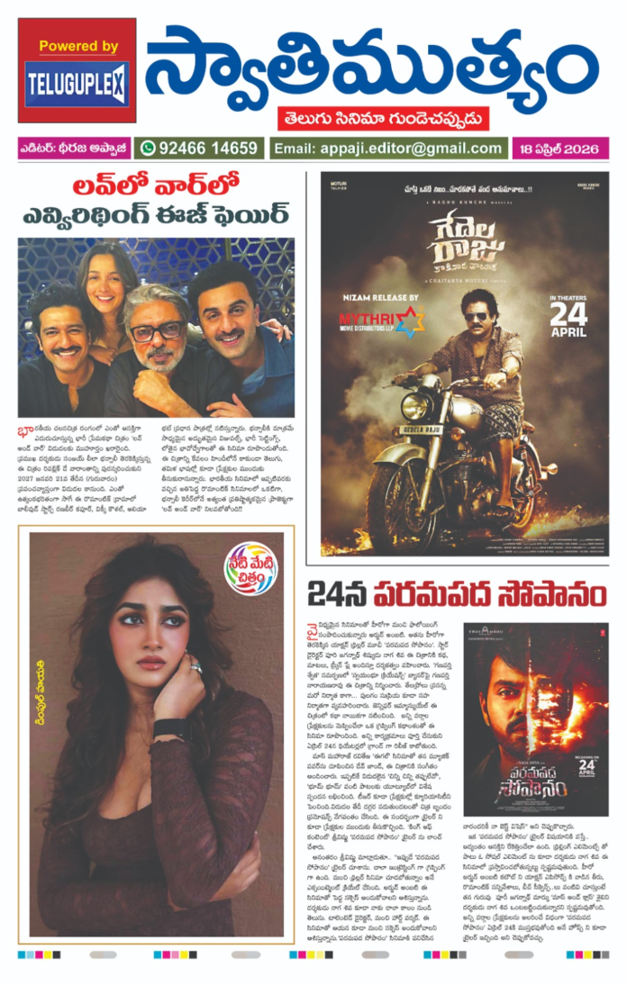 HomeEpaperSwathimutyam Epaper 18-04-2026 Epaper Swathimutyam Epaper 18-04-2026 By Teluguplex April 18, 2026 0 2 Share FacebookXPinterestWhatsApp - Advertisment - - Advertisment - Share FacebookXPinterestWhatsApp Previous articleహ్యూజ్ గ్లోబల్ ప్రాజెక్ట్ గా రాబోతున్న హీరో విజయ్ దేవరకొండ, డైరెక్టర్ శౌర్యువ్ Teluguplexhttps://lightgoldenrodyellow-wildcat-391238.hostingersite.com RELATED ARTICLES Epaper Swathimutyam Epaper 15-04-2026 April 15, 2026 Epaper Swathimutyam Epaper 13-04-2026 April 13, 2026 Epaper Swathimutyam Epaper 11-03-2026 April 11, 2026 LEAVE A REPLY Cancel reply Comment: Please enter your comment! Name:* Please enter your name here Email:* You have entered an incorrect email address! Please enter your email address here Website: Save my name, email, and website in this browser for the next time I comment. Most Popular హ్యూజ్ గ్లోబల్ ప్రాజెక్ట్ గా రాబోతున్న హీరో విజయ్ దేవరకొండ, డైరెక్టర్ శౌర్యువ్ April 18, 2026 24న పరమపద సోపానం’ April 18, 2026 ‘జెట్లీ’ మే 1న వరల్డ్ వైడ్ గ్రాండ్ రిలీజ్ April 18, 2026 2027 జనవరి 21న విడుదల కానున్న ‘లవ్ అండ్ వార్’ చిత్రం April 18, 2026 Load more Recent Comments
