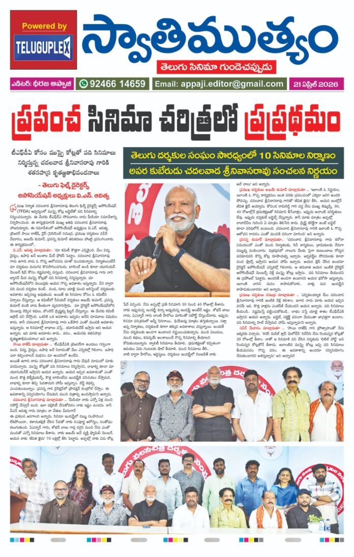 HomeEntertainmentSwathimutyam Epaper 21-04-2026 Entertainment Swathimutyam Epaper 21-04-2026 By Teluguplex April 22, 2026 0 4 Share FacebookXPinterestWhatsApp - Advertisment - - Advertisment - Share FacebookXPinterestWhatsApp Previous article‘పరమపద సోపానం’ విజయం సాధించాలని కోరుకుంటున్నాను..Next articleSwathimutyam Epaper 22-04-2026 Teluguplexhttps://lightgoldenrodyellow-wildcat-391238.hostingersite.com RELATED ARTICLES Entertainment MRP టీజర్ విడుదల April 22, 2026 Entertainment Swathimutyam Epaper 22-04-2026 April 22, 2026 Entertainment ‘పరమపద సోపానం’ విజయం సాధించాలని కోరుకుంటున్నాను.. April 22, 2026 LEAVE A REPLY Cancel reply Comment: Please enter your comment! Name:* Please enter your name here Email:* You have entered an incorrect email address! Please enter your email address here Website: Save my name, email, and website in this browser for the next time I comment. Most Popular MRP టీజర్ విడుదల April 22, 2026 Swathimutyam Epaper 22-04-2026 April 22, 2026 ‘పరమపద సోపానం’ విజయం సాధించాలని కోరుకుంటున్నాను.. April 22, 2026 సరికొత్త మర్డర్ మిస్టరీ కథతో తెరకెక్కించిన “గేదెల రాజు” April 21, 2026 Load more Recent Comments